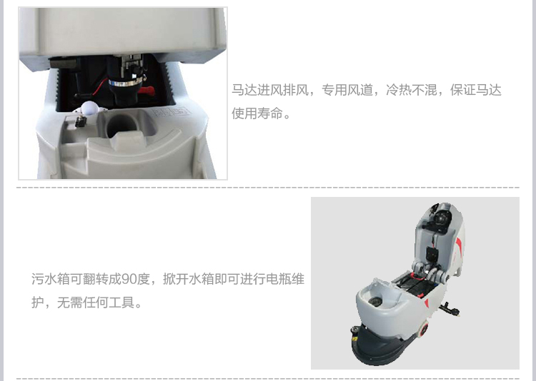 污水箱可翻轉(zhuǎn)成90°,掀開水箱即可進(jìn)行電瓶維護(hù),無需任何工具。