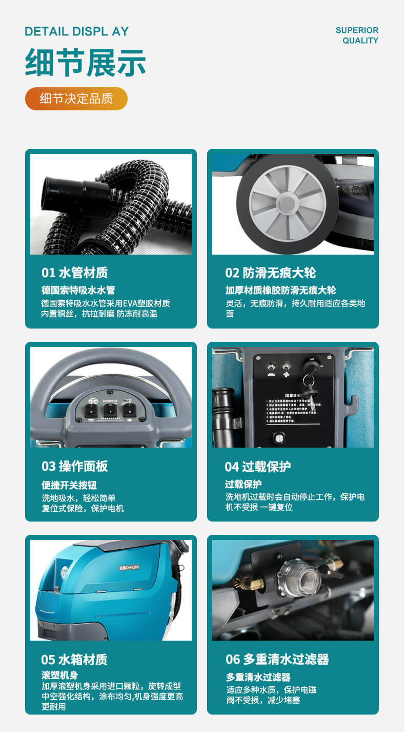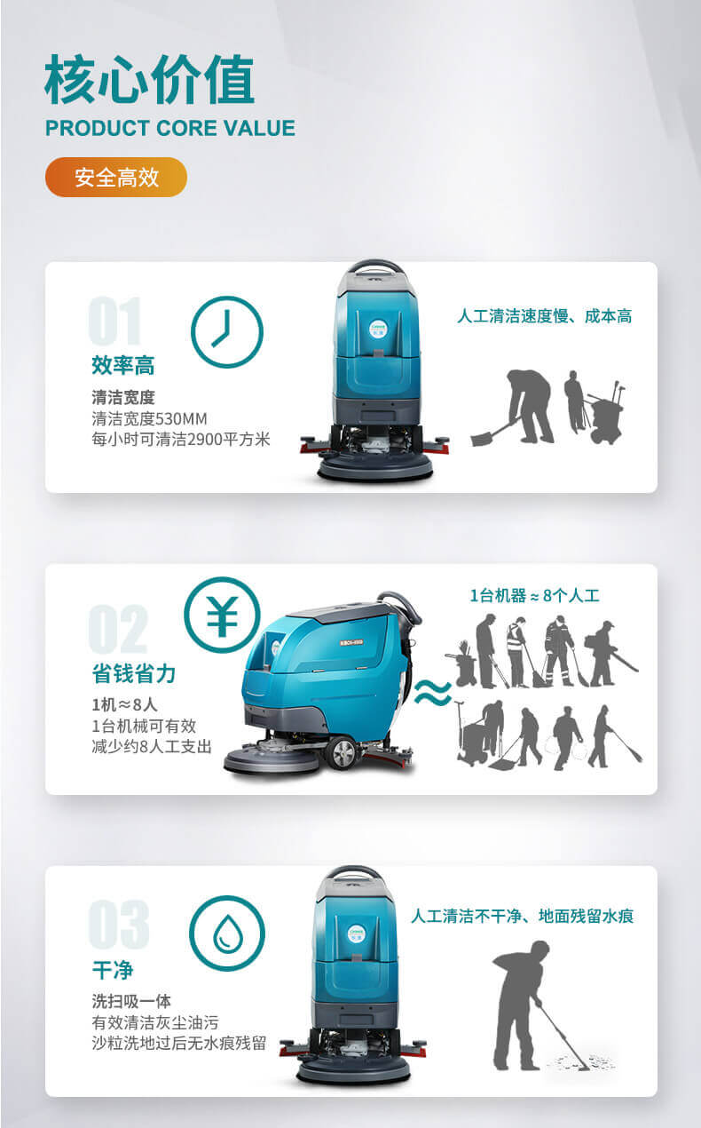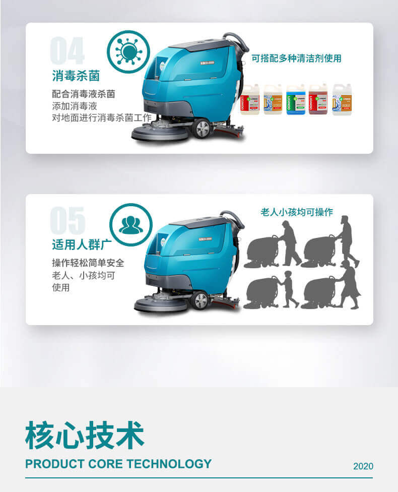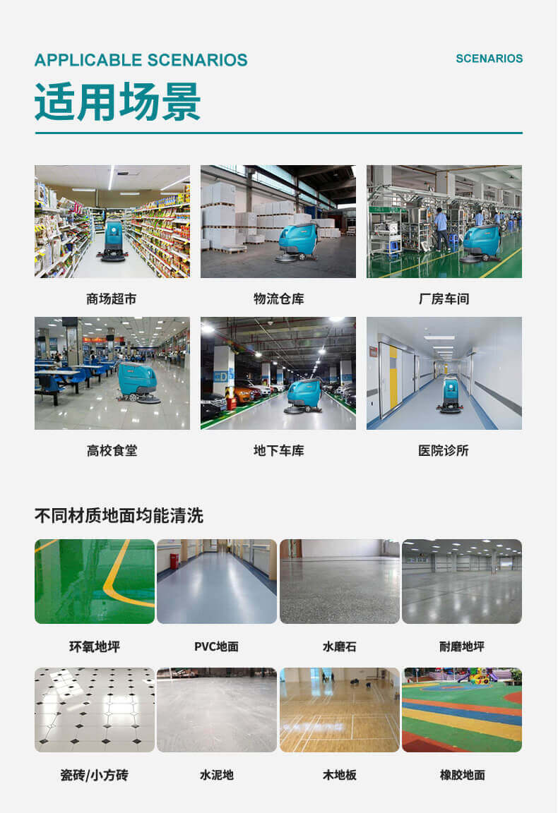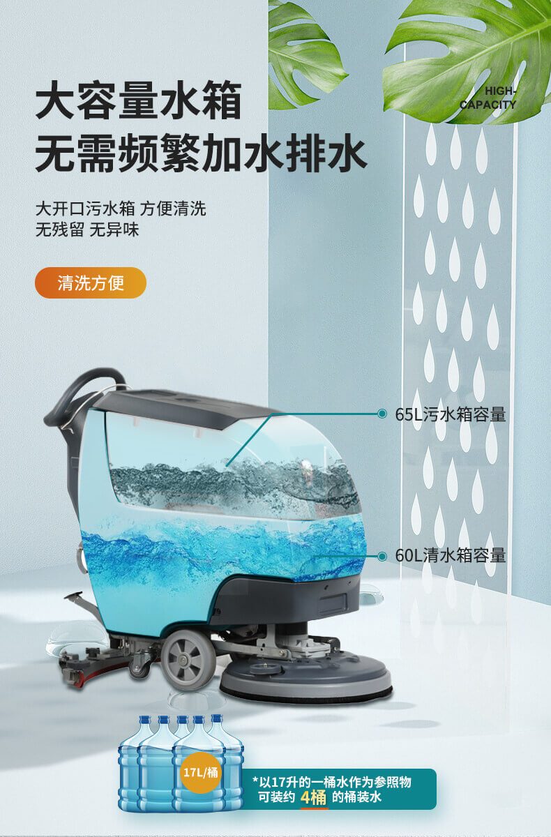 用途:自驅式洗地機,無需用力自動行走,省時省力低噪音,適用于醫院、學校、商超、超市、工廠等場所的硬地面清潔,機器有水質三重過濾系統,可以避免堵塞。洗擦、吸干一次性完成。